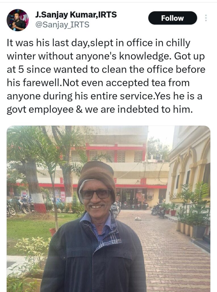 रामेश्वर आपल्या सेवेनिवृत्तीच्या शेवटच्या दिवशी देखील, कडाक्याच्या थंडीमध्ये ऑफिसमध्येच झोपले होते. बहुधा अनेकांनी आपला शेवटचा दिवस सेलिब्रेशनसाठी, निरोपासाठी किंवा विश्रांतीसाठी राखून ठेवला असता. पण रामेश्वर सकाळी ५ वाजता उठले आणि कोणालाही काही न सांगता, संपूर्ण ऑफिसची स्वच्छता करून टाकली. जणू हेच त्यांचं आपल्या कृतीतून सेवेला वंदन करणं होतं –